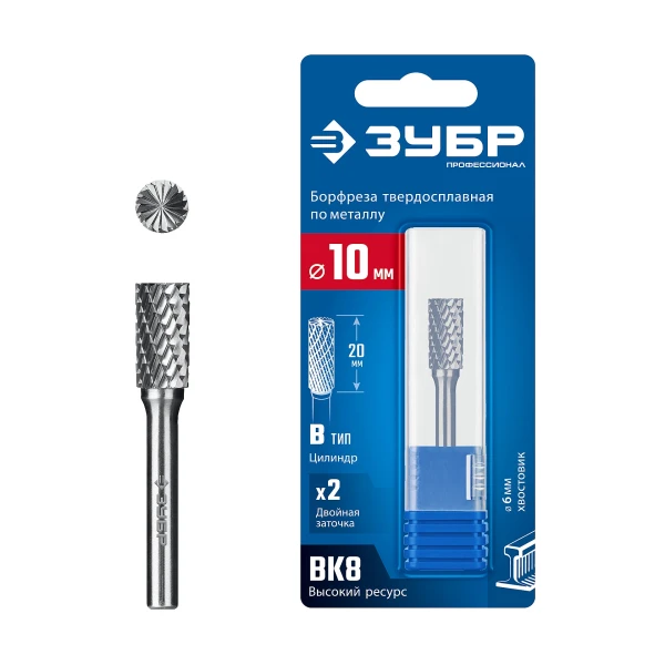 ЗУБР 10х20 мм, тив B (цилиндр с торцевыми зубьями), хв-к 6 мм, твердосплавная борфреза, ПРОФЕССИОНАЛ (28801-10-20)