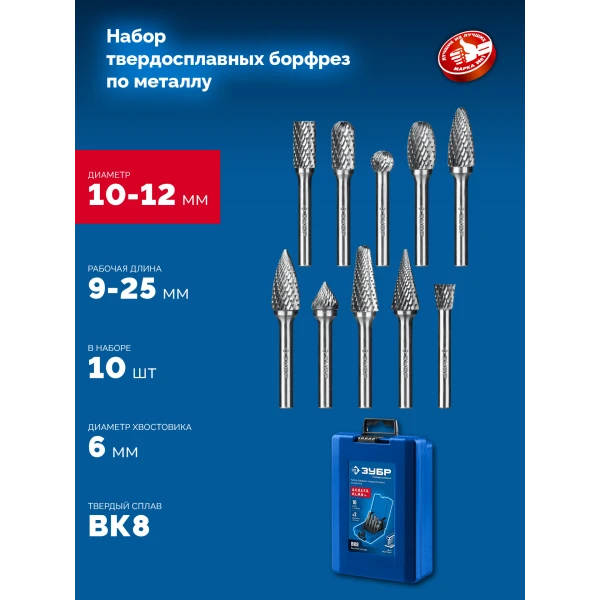 ЗУБР 10 шт набор борфрез твердосплавных, хв-к 6 мм, ПРОФЕССИОНАЛ (28815-H10)
