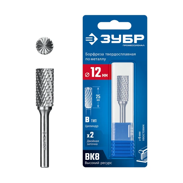 ЗУБР 12х25 мм, тив B (цилиндр с торцевыми зубьями), хв-к 6 мм, твердосплавная борфреза, ПРОФЕССИОНАЛ (28801-12-25)
