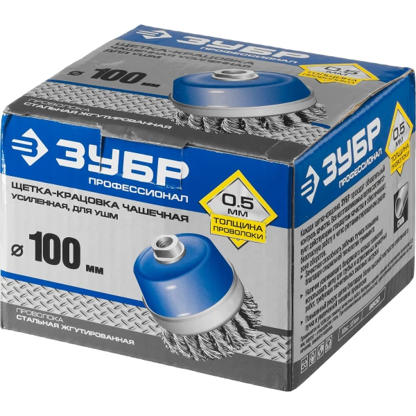 ЗУБР 100 мм, жгутированная стальная проволока 0.5 мм, усиленная чашечная щетка-крацовка для УШМ, Профессионал (3527-100)