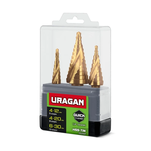 URAGAN 3 шт, 4-30мм, винтовая спираль, набор сверл ступенчатых(29658-4-30-H3)