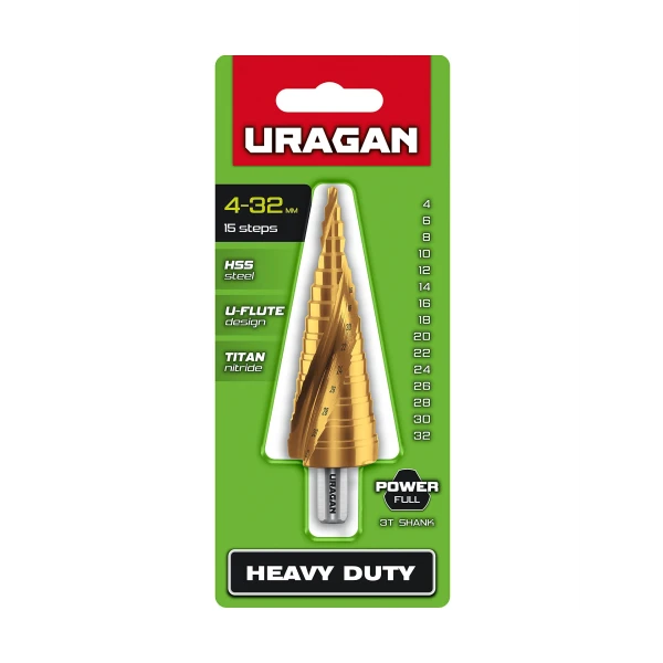 URAGAN 4-32мм, 15 ступеней, винтовая спираль, сверло ступенчатое (29658-4-32-15)