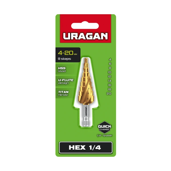 URAGAN 4-20мм, 9 ступеней, винтовая спираль, сверло ступенчатое(29658-4-20-9)