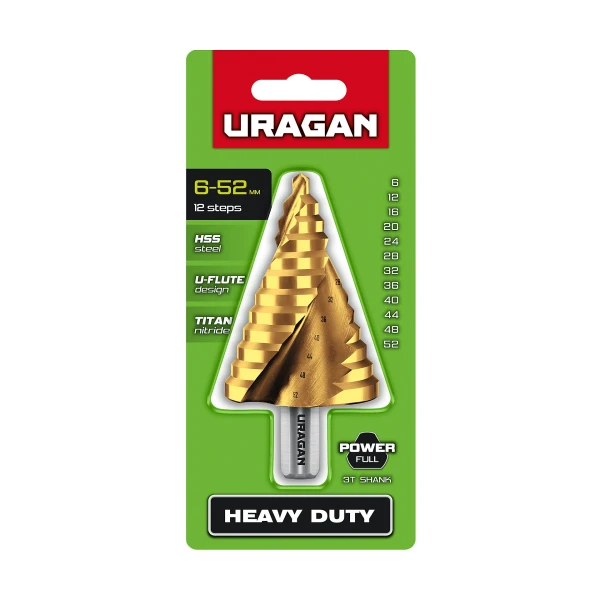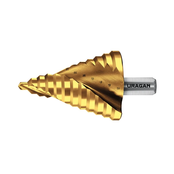 URAGAN 6-52мм, 12 ступеней, винтовая спираль, сверло ступенчатое(29658-6-52-12)