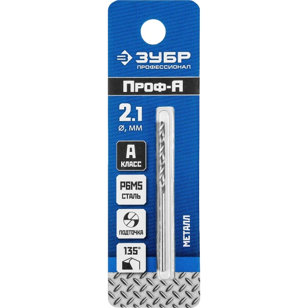 ЗУБР ПРОФ-А, 2.1 х 49 мм, сталь Р6М5, класс А, сверло по металлу, Профессионал (29625-2.1)