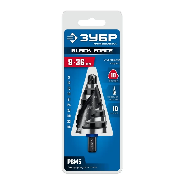 ЗУБР BLACK FORCE 9-36мм, 10 ступеней, винтовая проточка, сверло ступенчатое, ПРОФЕССИОНАЛ (29671-9-36-10)