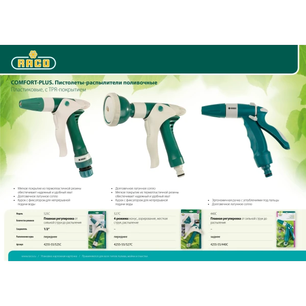 Поливочные пистолеты-распылители RACO Comfort Plus это линейка инструментов с повышенным уровнем качества. Надёжны в работе, служат долго, исключительно комфортны в использовании.
