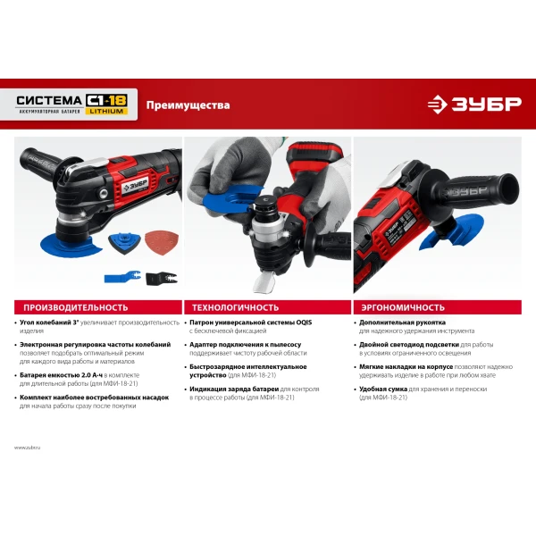 ЗУБР C1-18, 18 В, OQIS, АКБ (2 А·ч), реноватор, сумка, набор насадок (МФИ-18-21)