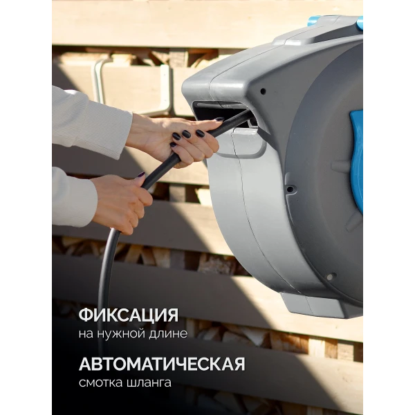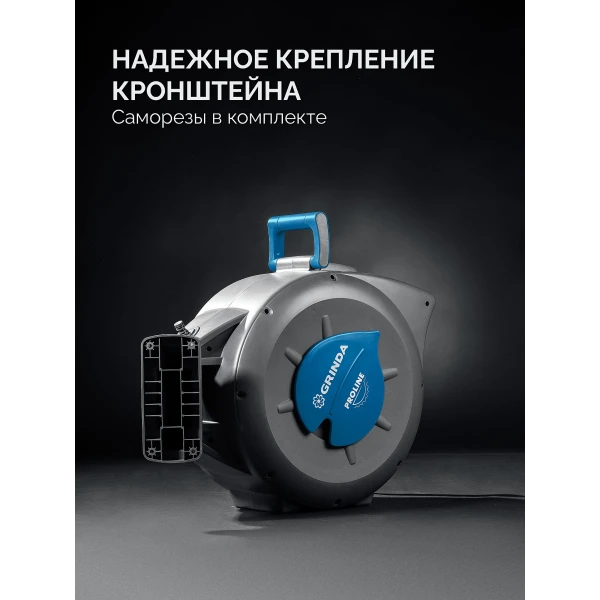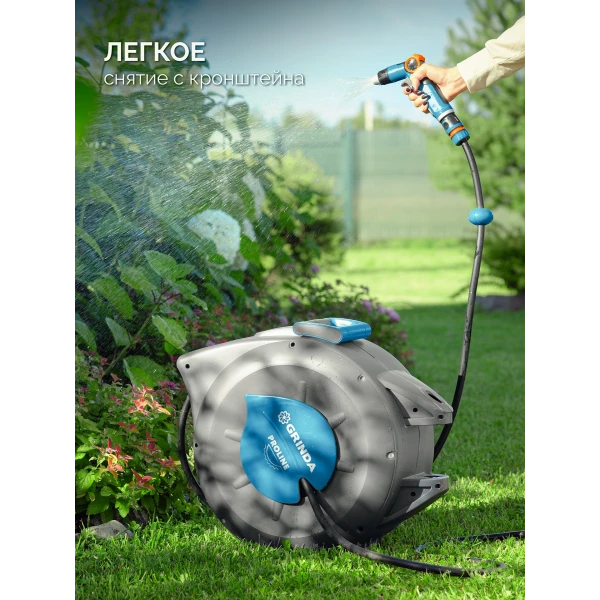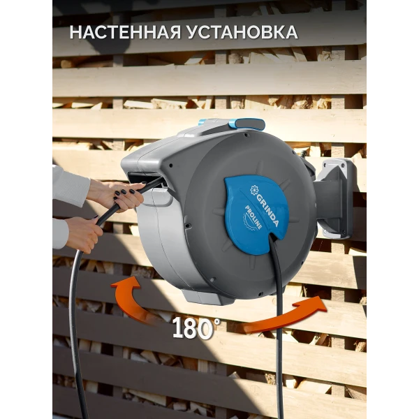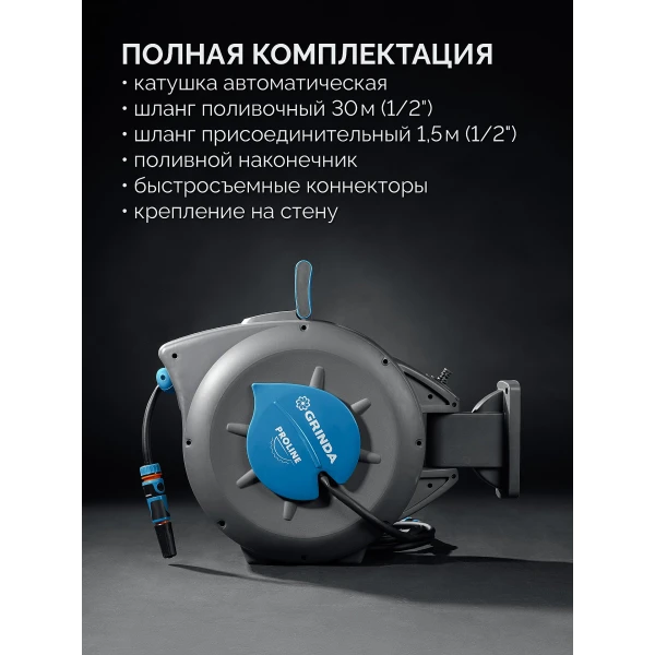 GRINDA HRA-30, шланг 30м x 1/2″, на поворотном кронштейне настенная, поливочный набор 4 предмета, катушка автоматическая со шлангом ProLine (428471)