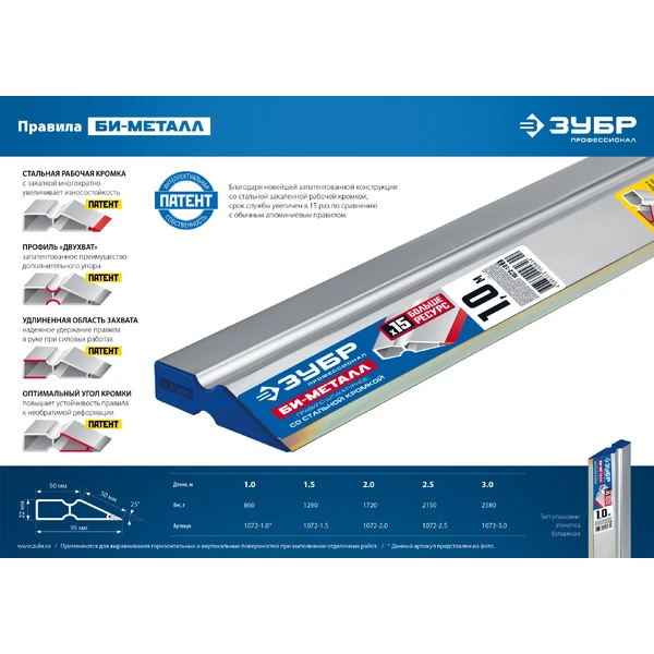 Благодаря новейшей запатентованной конструкции со стальной закаленной рабочей кромкой, срок службы увеличен в 15 раз по сравнению с обычным алюминиевым правилом