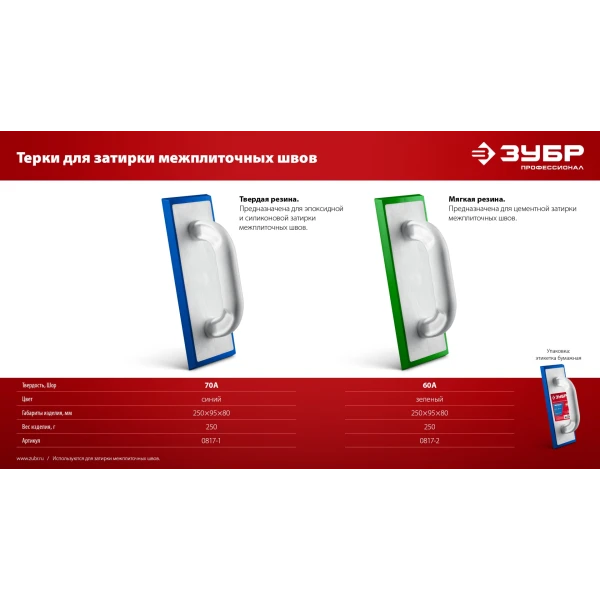 ЗУБР 250 х 95 мм, терка для затирки межплиточных швов, твердая резина (0817-1)