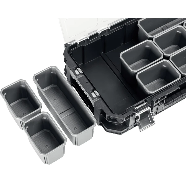 - Данная модель оснащена специальными боковыми защелками для надежной фиксации блоков между собой. Это позволяет создать единую надежную конструкцию и перевозить большие объемы инструмента.