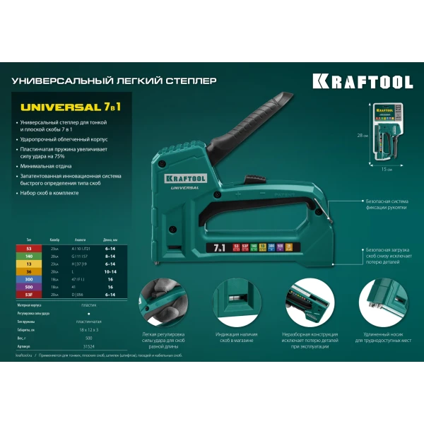 KRAFTOOL Universal, 7-в-1: 53 (A/10/JT21) 23GA (6 - 14 мм)/140 (G/11/57) 20GA (8 - 14 мм)/13/53F/36/500, универсальный легкий степлер (31524)