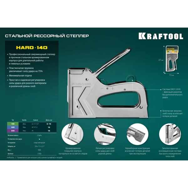 KRAFTOOL EXTREM 140, тип 140 (G/11/57) 20GA (6 - 16 мм)/300/500, стальной рессорный степлер (3185)
