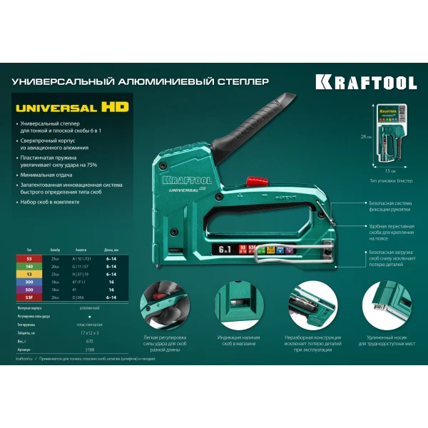 KRAFTOOL Universal-HD, 6-в-1: 53 (A/10/JT21) 23GA (6 - 14 мм)/140 (G/11/57) 20GA (8 - 14 мм)/13/53F/300/500, универсальный алюминиевый степлер (3188)