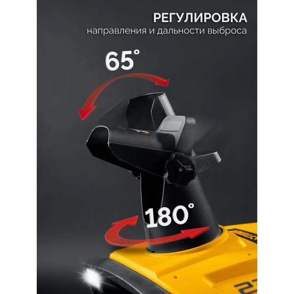- Горизонтальная и вертикальная регулировка направления выброса снега позволяет скидывать снег в нужное место в диапазоне 180 градусов на расстоянии до 10 метров