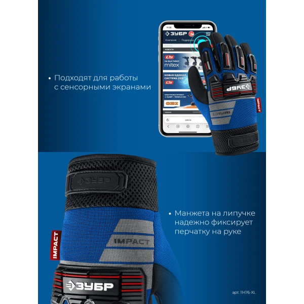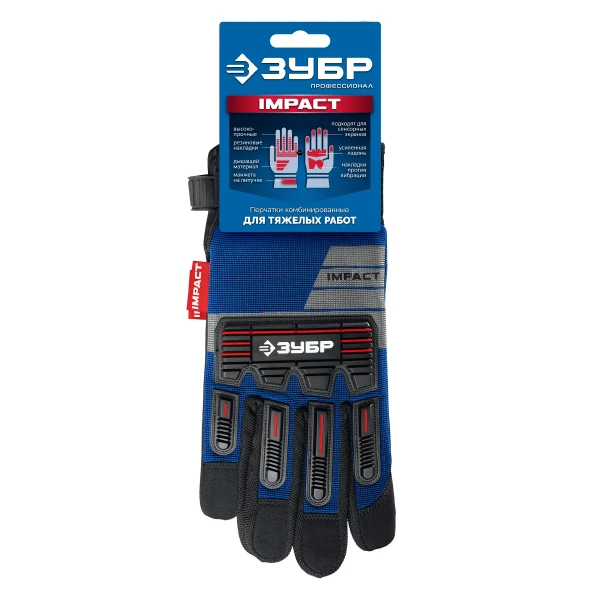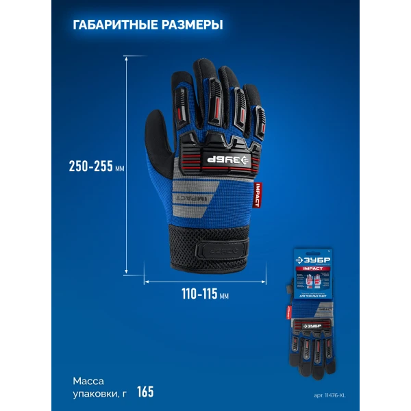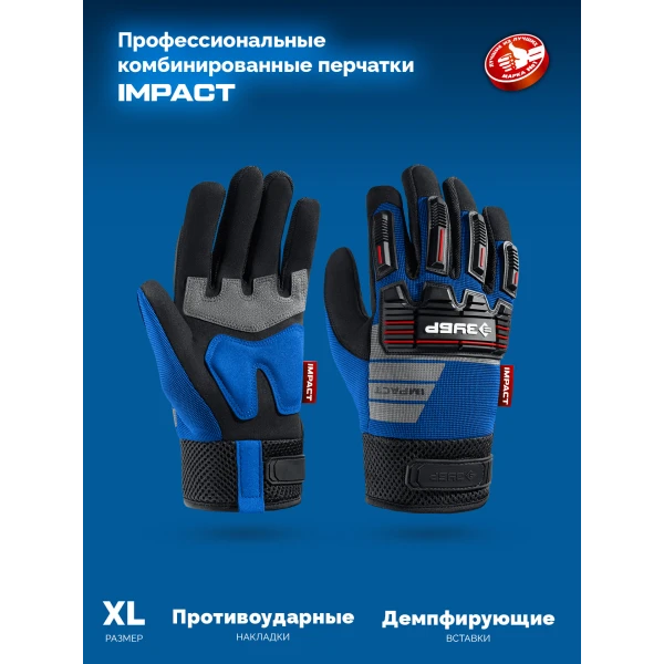 ЗУБР IMPACT р.XL (10), синие, профессиональные комбинированные перчатки, антивибрационные, противоударные, Профессионал (11476-XL)