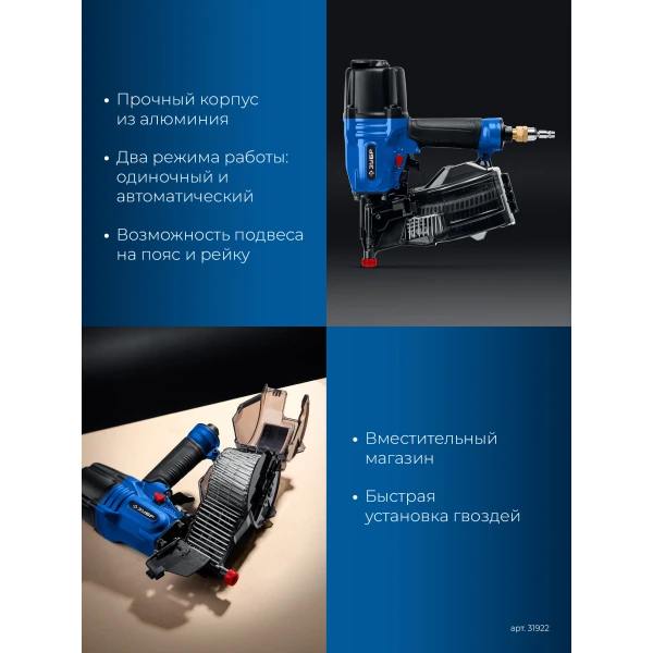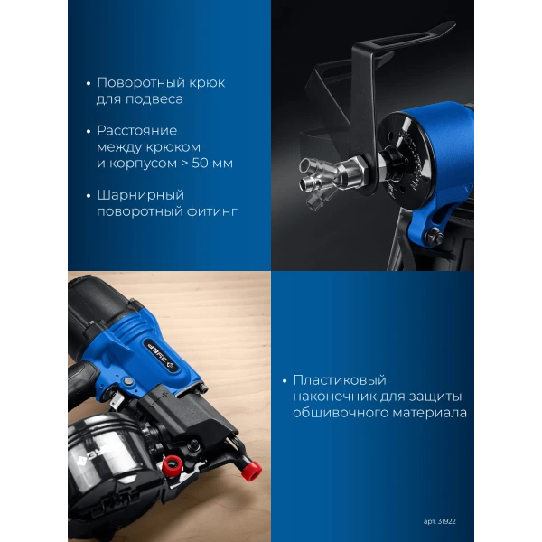 Нейлер пневматический отделочный предназначен для отделочных работ с гвоздями барабанного типа длинной 22-45 мм.Работает как с обычными гвоздями так и с оцинкованными на пластиковой ленте.