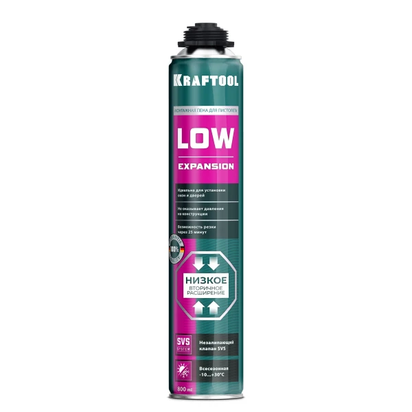 KRAFTOOL LOW EXPANSION, 800 мл, пистолетная, всесезонная, SVS, не залипающий клапан, выход до 50 л, монтажная пена (41181)