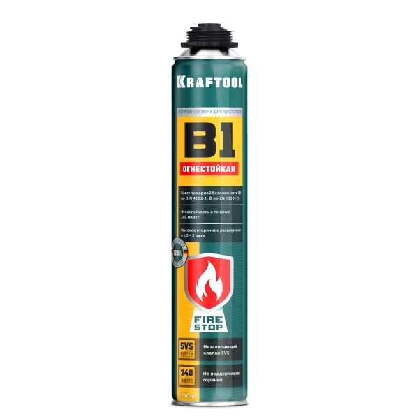 KRAFTOOL FIRE STOP B1, 750 мл, пистолетная, огнестойкая, не залипающий клапан, 240°С, SVS, выход до 45 л, монтажная пена (41186)