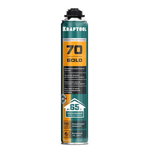 KRAFTOOL GOLD 65, 850 мл, выход до 65 л, мелкопористая, пистолетная всесезонная, SVS, не залипающий клапан, монтажная пена (41194)