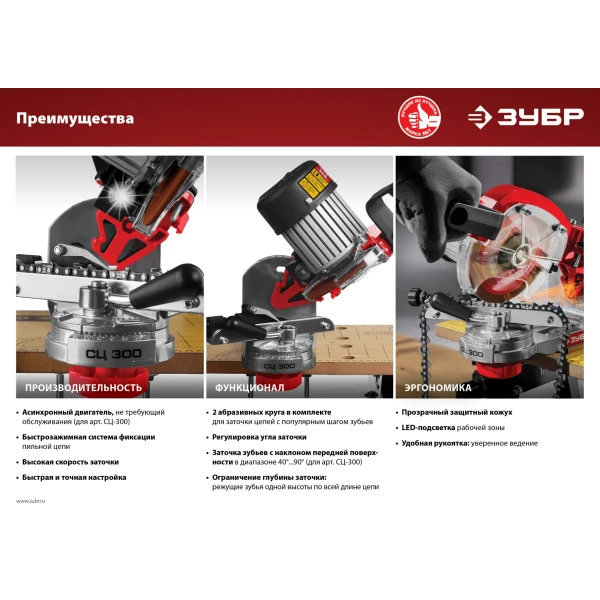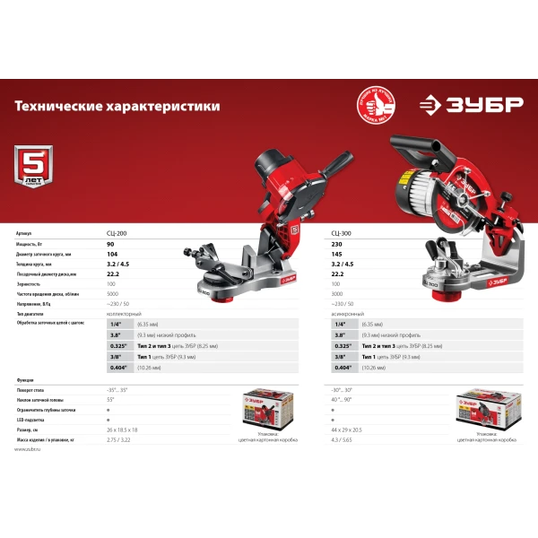 | Типы заточных цепей | - 1/4″ (6.35 мм), - 3.8″ (9.3 мм) низкий профиль, - 0.325″ (8.25 мм) Цепь ЗУБР тип 2 и тип 3, - 3/8″ (9.3 мм) Цепь зубр тип 1 , - 0.404″ (10.26 мм) |