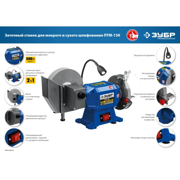 Станок заточной ЗУБР ПТМ-150 – незаменимый инструмент для гаража, мастерской, используемый для заточки режущего инструмента и сухого/мокрого шлифования металлических заготовок. Простота конструкции, высокая надежность, компактный размер, два камня с разной зернистостью, возможность мокрого шлифования – все что нужно для настоящего мастера, ценящего качество и рассчитывающего на долгий срок службы.