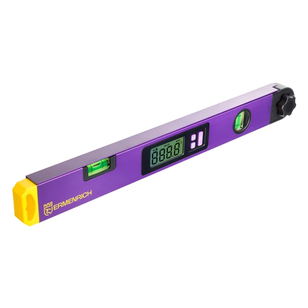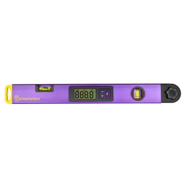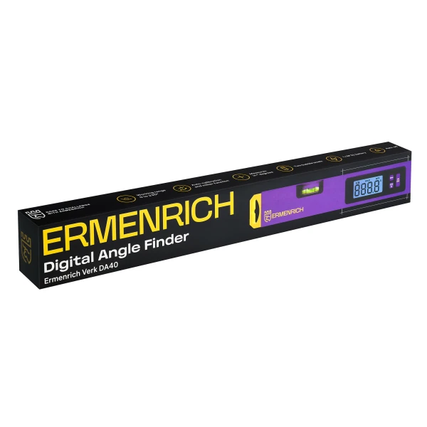 Угломер Ermenrich Verk DA40 проводит измерения в диапазоне 0–230 градусов. Корпус дополнен двумя встроенными пузырьковыми уровнями для точного позиционирования и отличается высокой прочностью: материалами для него послужили алюминий и ABS-пластик. Среди других преимуществ прибора – автоматическая калибровка и функция установки на ноль. Работает угломер от стандартной 9-вольтовой батарейки типа «Крона». Предусмотрена опция автоотключения, помогающая продлить срок работы прибора от одной батарейки.