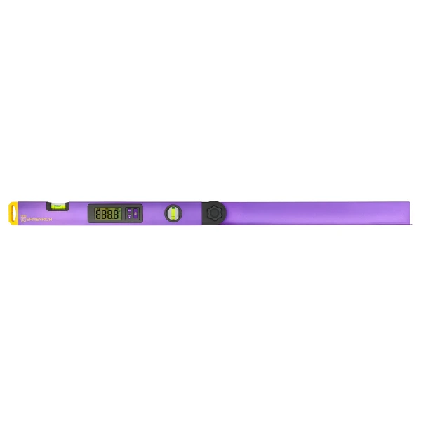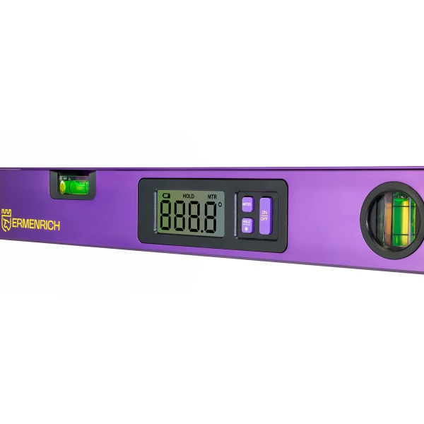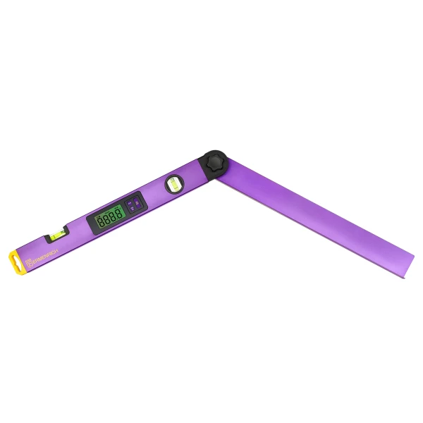 Ermenrich Verk DA40 – это цифровой угломер, который станет надежным помощником строителя, мастера по ремонту или монтажу оборудования. Прибор служит для точного измерения углов между поверхностями, а также может использоваться при распиловке длинных заготовок благодаря режиму расчета угла распила. Чтобы запустить этот режим, необходимо сохранить измеренное значение угла с помощью опции «Hold», а затем преобразовать его в величину угла среза, которая выставляется на торцовочной пиле. Управление функциями осуществляется с помощью удобных кнопок рядом с ЖК-экраном.