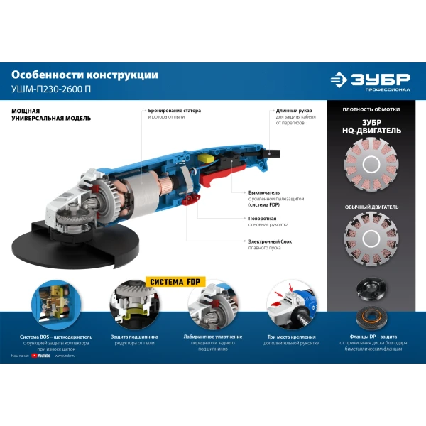 ЗУБР 2600 Вт, d230 мм, УШМ, Профессионал (УШМ-П230-2600 П)
