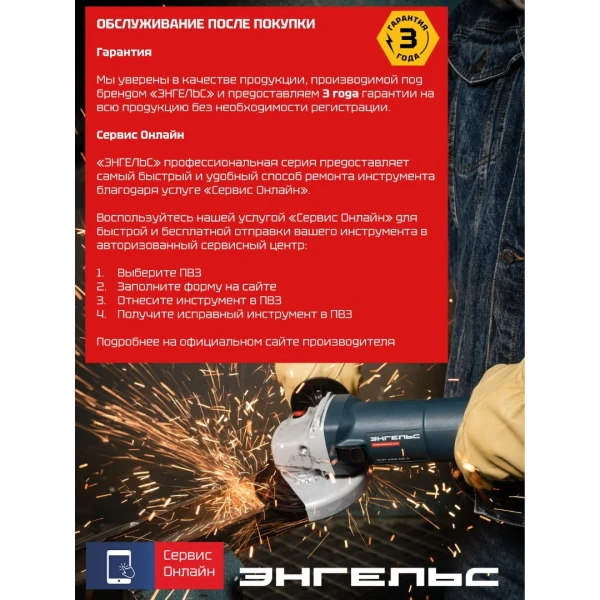 Стандартный срок гарантии - 3 года. ЭНГЕЛЬС предоставляет быстрый и удобный способ ремонта инструмента благодаря услуге «Сервис Онлайн». Подробную информацию о сервисном обслуживании можно найти на официальном сайте производителя.
