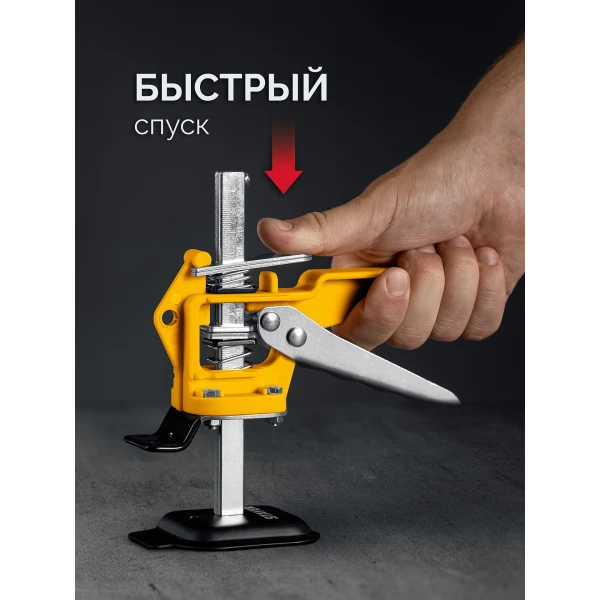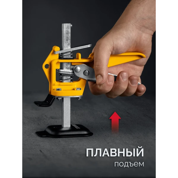 Универсальный подъемник STAYER надежный помощник при проведении монтажных работ тяжелых и крупногабаритных предметов, таких как: крупноформатная плитка, кухонные гарнитуры и шкафы, двери и различные панели. Подъемник может поднять груз до 50 кг на высоту до 84 мм. Прорезиненная лапка защищает поднимаемый предмет от повреждений и соскальзывания.
