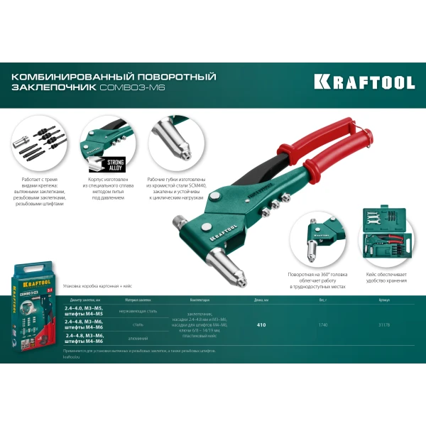 KRAFTOOL Combo3-M6, 360°, 3 вида заклёпок, комбинированный поворотный заклепочник в кейсе (31178)