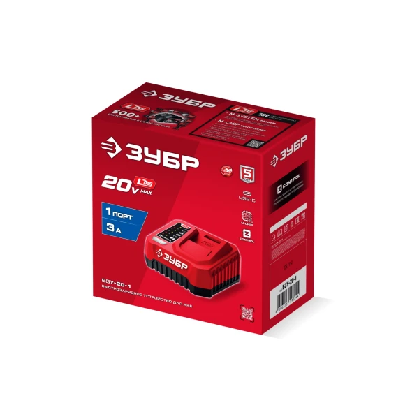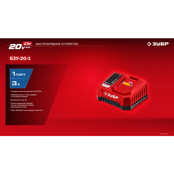 ЗУБР 20 В, 1 порт, 1 х 3 А, зарядное устройство для LMS АКБ (БЗУ-20-1)