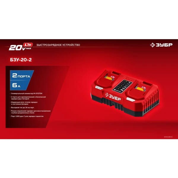 ЗУБР 20 В, 2 порта, 2 х 3 А, зарядное устройство для LMS АКБ (БЗУ-20-2)